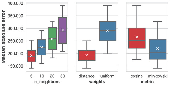Distribution of the median average error based on the different parameters for the k-nearest neighbors.