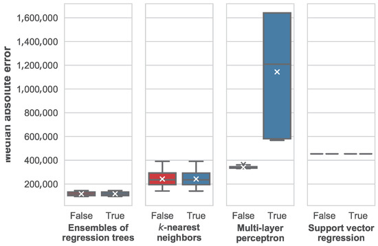 Distribution of the median average error based on the use of normalization for the different machine learning techniques.