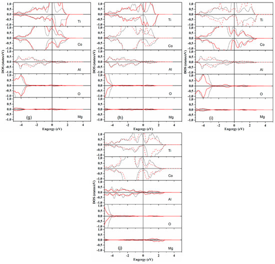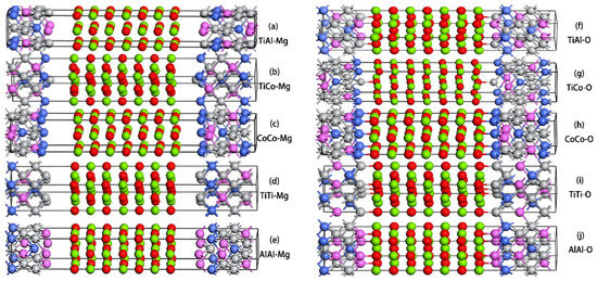 The structures in Figure 1 represent the lowest-energy configurations after the geometry optimization. The interface atomic layers were planar before the optimization, and the optimized atomic layers were uneven due to the different atomic interactions. As can be seen in Figure 1a–e, in the alloy–Mg terminations, all interface atoms, especially the Co atoms, demonstrated an inward movement, which was similar to their surface behaviors in Heusler alloys [14,34]. In the Heusler terminations where the interface atoms came in contact with the top Mg atoms, the Heusler and MgO atomic layers were repelled very far. For the alloy–O terminations, the distance between the Heusler and MgO layers was reduced due to the atomic bonding interaction at the interface layers (see Figure 1f–j). The shrinking phenomenon of interface atoms could still be observed.