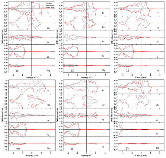 All calculations were performed using the CASTEP Package and by adopting the density functional theory (DFT). The exchange–correlation interaction was described by performing Perdew–Burke–Ernzerhof (PBE) generalized gradient approximation (GGA) [35]. To deal with the electron–ion interaction, we adopted Vanderbilt-type ultrasoft pseudopotentials [36] and the valence electron configurations of Ti (3d24s2), Co (3d7s2), Al (3s23p1), Mg (3s2), and O (2s22p4). For the optimizations of the bulks, we initially assumed that all alloys were ferromagnetic and then applied spin polarization and the 7 × 7 × 7 mesh of special k-points in the Brillouin zone. In the self-consistent calculation, we selected the refined 1 × 10−6 eV/atom and 360 eV as the self-consistent field (SCF) convergence criterion and energy cutoff, respectively. When the positions of atoms were relaxed, we set a convergence criterion of 0.02 eV/Å. To investigate the electronic density of states, we inserted a refined 0.3 Å grid space between k-points in the Brillouin zone. For the interface calculations, we geometrically optimized all supercells using the same parameters employed in the bulk calculation. All technical parameters were tested carefully to ensure the accuracy of the results.