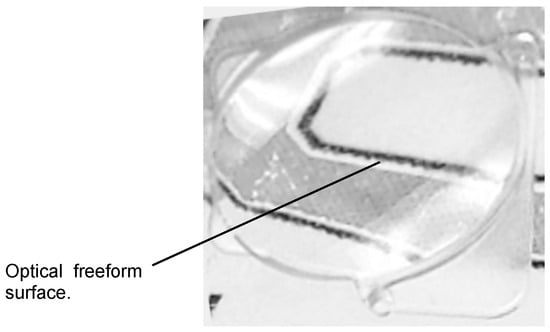 A set of injection molding simulation experiments was carried out to form a basis to design the mold and to derive the process parameters [29]. On the basis of these simulation experiments, molding tools were fabricated by which the freeform optics was molded. Figure 1 depicts a photograph of a freeform lens manufactured by the µIM process.