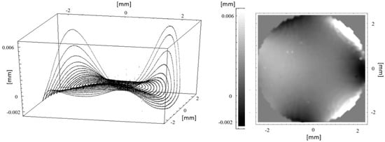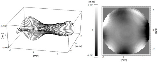 An atomic scale profiler was used to measure the manufactured surfaces. The profiler used was a Panasonic UA3P with a resolution of ±0.1 µm at an inclination angle of 70°. The measurement range was adjusted to φ5 mm. Measurements were conducted on concentric circles, the spatial frequency was set to 48 cyc/aperture, resulting in a radial distance of 0.1 mm. One measurement consists of 50,000 measurement points. The measurement was targeted to detect the surface form deviation error, which is an LSF error. To analyze MSF errors linear scanning of the sample would be the preferred procedure. One advantage of conducting the measurement on radial paths is avoidance of a device oscillation. Figure 2 depicts the residuals in lens sag based on a reduced data set on a 48 × 48 grid (2304 measurement points), plotted along the measurement path (left) and as a contour plot (right). High residues are found at the coordinates near {2 mm, 2 mm} and {2 mm, −2 mm}. Otherwise, the surface looks notably smooth. Some non-uniformly distributed pits can be observed, interpreted as artifacts caused by the tactile measuring process.