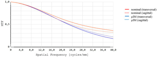 The results presented in Table 4 show that the optics manufactured using the µIM/comp-process performs very closely to the nominal value. The deviations in performance are as small as 2% in maximum. The effect of improvement of the MTF by means of the µIM/comp-process can also be observed in Figure 7 showing the graphs of the simulated MTFs for the different molding processes (µIM and µIM/comp) in comparison with the nominal optics. The graphs are depicted for the central field and an allocation of infinite focal length.