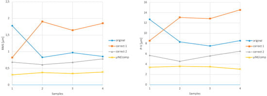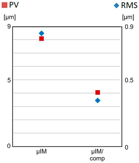 Noticeable is the smooth surface. The improvement of the surface form deviation can be seen clearly by comparing Figure 2 and Figure 5. Of course, this aspect can also be seen regarding the PV and RMS errors, resulting in 4.1 µm and 0.34 µm, respectively. Figure 6 shows the PV and RMS value of the Alvarez-surface manufactured by the two microinjection molding processes. The improvement of the compensated surface manufactured by means of the µIM/comp-process is obvious.
