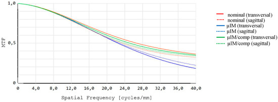 MTF derived with the compensated injection-molded freeform optics included (green) in comparison with Figure 3.