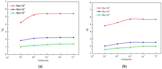 Grid independence study (a) and (b) with different Rayleigh numbers.