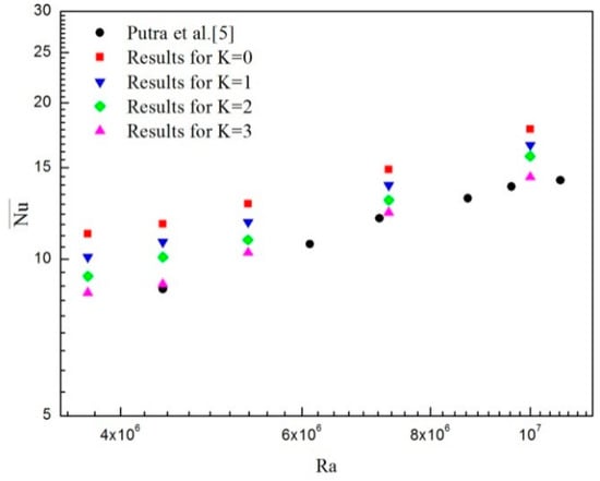 Comparison of the average Nusselt number with experimental results of Putra et al. [5] versus Rayleigh number with increasing vortex viscosity parameter K for φ = 4%.