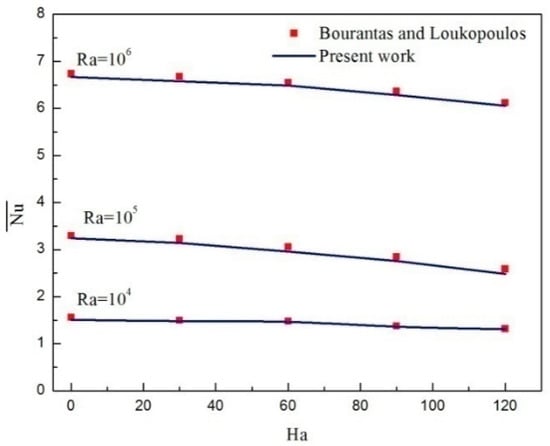 The third validation concerns the model of micropolar nanofluid under a magnetic field. To that end, a 2-D version of our code is derived and the results are verified against the numerical solutions reported by Bourantas and Loukopoulos [41]. As revealed in Figure 4, a very good agreement is found.