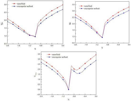 Comparison between micropolar and non-micropolar nanofluid models are made in terms of , and U3max as per the buoyancy ratio illustrated in Figure 5. It can be observed for a micropolar nanofluid model that all of , and U3max are smaller than that of a pure nanofluid model regardless the value of N considered. This gap is minimized adjacent to the transition value of N = −1 and the disparity is more significant for the thermal buoyancy-dominated zone.