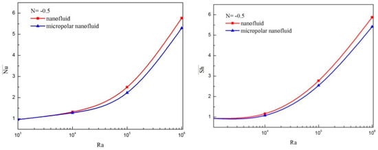 Variation of and against the Rayleigh is shown in Figure 6. Both micropolar and non-micropolar nanofluid models are considered with N = 0.5 in the thermal buoyancy-dominated regime and N = 2 in the solutal buoyancy-dominated regime. Both and are smaller than when considering the micropolar theory regardless of the value of Ra for both values of buoyancy ratio. However, the gap is more prominent when the Rayleigh numbers are enhanced. The current observations are in good agreement with the results of Bourantas and Loukopoulos [41] for two-dimensional flow by considering only the thermal gradient.