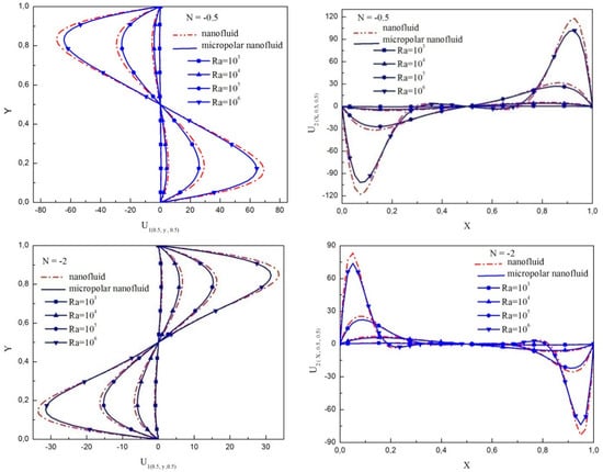 Figure 7 elucidates the variations of the horizontal and vertical velocity components at the Z = 0.5 plane according to the Rayleigh numbers for N = −0.5 and N = −2. Regardless of the modelconsidered, it is noticed that with increase in Rayleigh numbers, the flow regime is intensified and the magnitude of each component of velocity is increased. However, their magnitudes are higher in the case of ordinary nanofluid than in that of micropolar nanofluid. This difference becomes more significant for Ra up to 104 and implies that the insertion of the vortex viscosity parameter decelerates the principal flow strength for both regimes.