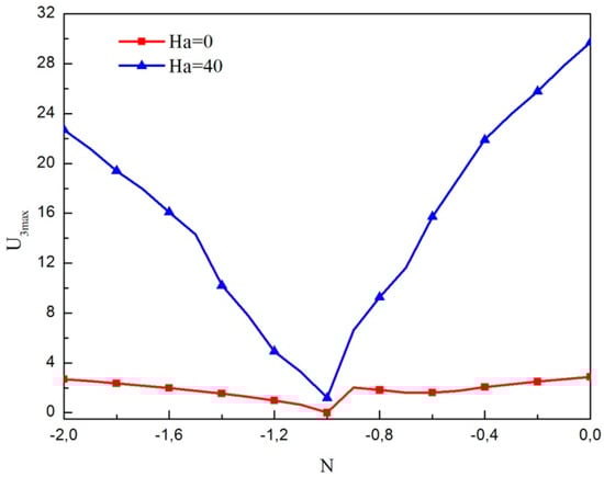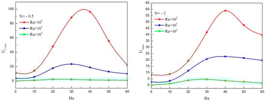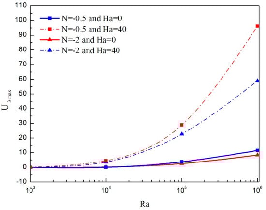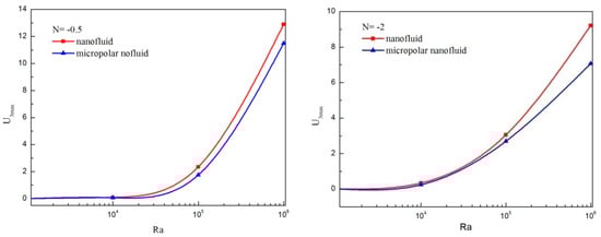Figure 8 shows the maximum of the transverse velocity for various Rayleigh number applying the micropolar and non-micropolar nanofluid models in the absence microrotation for N = −0.5 and N = −2. For both cases, U3max is smaller without considering the micropolar theory and the gap is more noticeable when Ra outdoes 104. Hence, the consideration of micropolar material parameter weakens the three-dimensional character of the flow.