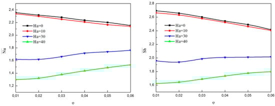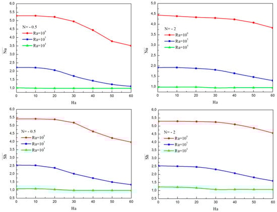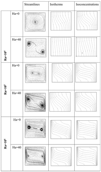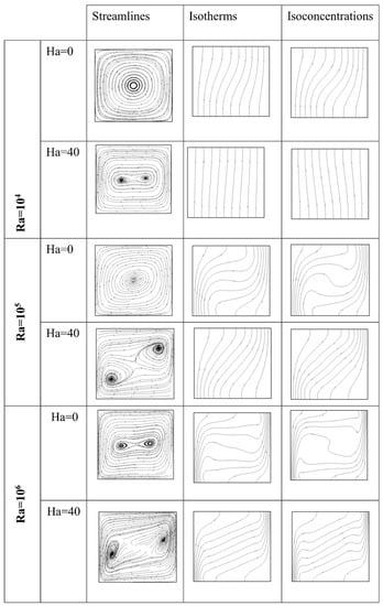 When Ha = 0, an increase in Ra changes the direction of isotherms from almost vertical to the horizontal in the core and are stacked near the active walls. An isoconcentrations central zone is created and extended to the upper and lower regions of the enclosure as Ra increases. Once Ha = 40, both the thermal and solutal gradients diminish near the active walls. Furthermore, the temperature and concentration contours become inclined and parallel to each other within the core of the cavity as Ra increases and these changes in direction is an indication of weakness in convection flow due to the magnetic field.