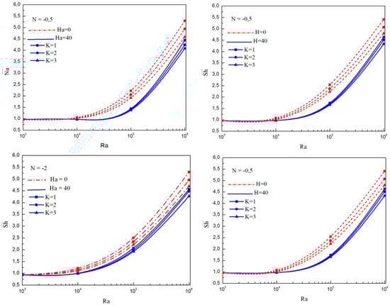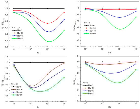 Figure 10 displays similar results as shown in Figure 9 except for N = −2. For this specific value of N, the main flow direction is reversed due to the enhancement in solutal effect. In the presence of magnetic field, the flow involves a counter-clockwise rotating main cell with two inner vortexes slightly titled to the hot wall and move towards the isothermal walls as the Rayleigh number increases.