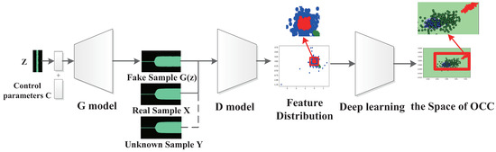 It is difficult to collect all possible sample classes in reality; here will be some unmarked categories, called unknown classes. The machine learning algorithm based on the statistical learning method cannot use the prior probability knowledge to identify an unknown class. Therefore, it is important to construct a more accurate model to deal with the unknown classes. In order to solve this problem, we propose the OCC model based on the generative adversarial networks (OCC-GAN), as shown in Figure 3.