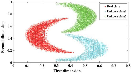 Many researchers have noticed this OCC problem and proposed many excellent solutions [35,36,46]. However, there are still some shortcomings while we make use of the similarity or the distance threshold as the inspection standard. All these methods require that the feature distribution space is all included in the hypersphere, but this is not the case in reality. Suppose the feature distribution of the sample is the shape of Figure 4 [47]; under this circumstance, there are errors when we take advantage of the distance threshold.