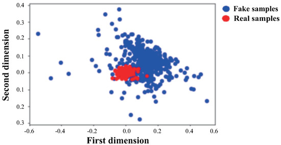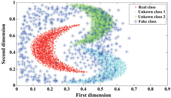 However, the model sometimes is unstable during training. The fake samples generated by the GAN model do not completely surround the training samples. As shown in Figure 9, most of them tend to be in the upper right corner, and the vacancies exist in the lower left corner. As we can know, the sample is too scattered and not uniform enough to closely surround the feature distribution of known classes.