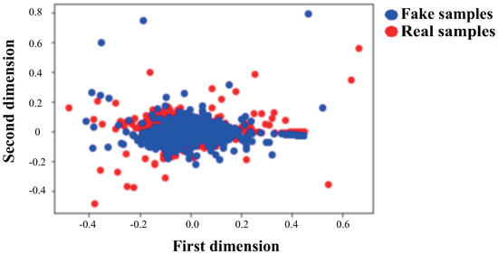 Therefore, we improved the algorithm and divided Equations (6) to (14) into two steps. The training of the GAN model is separated from the process of the generated fake samples, as shown in Equations (15) and (16). Additionally, we change the to the cosine similarity distance, as shown in Equation (17).