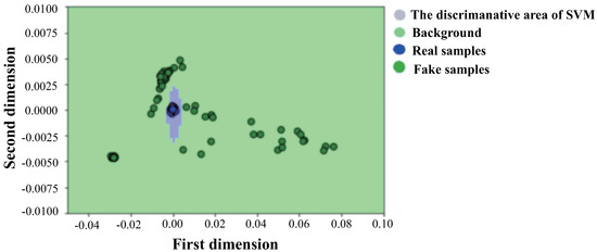 Based on the above theory, we train several real IoT device wireless signals as shown in Figure 8. The gray part shows the discriminative area of the SVM, blue points are the real training samples, and green points are the generated fake samples. It can be seen that the training sample is surrounded by the generated sample. If the feature distribution of the unknown class is far from the real sample, it will be mapped outside the gray area. According to the probability of the SVM, we can learn whether the test sample class belongs to the unknown one. Besides, it can give the probability as well.