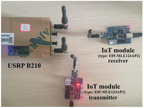 As shown in Figure 12, the experimental data are acquired by universal software radio peripheral (USRP) with a sampling frequency of 48 MHz and a bandwidth of 10 MHz, and the type of IoT module is E05-MLE124AP2, which is a wireless transceiver module, operates at 2.4 GHz with small-size and 100 mW transmitting power. Because of its stable performance, small-size by professional hard design and being commonly used, this module are convenient for all kinds of embedded development. Therefore, we take this module representing the IoT devices to construct our experiment.