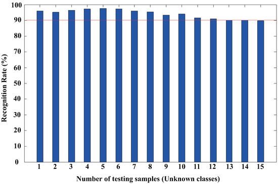 Here, we collect the signals of the transmit module with the same receive module as the training samples, and the No.1 to No.3 IoT equipment are used as training classes, and No.5 to No.19 equipment are tested as unknown classes. Then, the test results are averaged after training. As shown in Figure 13, with the increasing of the test classes, the OCC rate decreases slowly, and the recognition rate of overall unknown class is above 90%. The OCC model not only needs to have an accurate identification of the unknown classes, but also the known classes. To this end, with No.1 to No.3 test samples inputting into this model, the recall rate of the known classes is 97.0% after average. It can be seen that the model can better identify the known classes.
