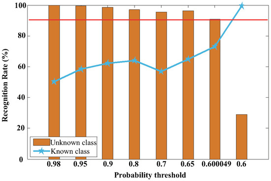 OvR-SVM is one of the most common approaches to deal with the multi-class OCC problems based on the “one-to-many” training method, which is often used to construct multi-class identification. The improving OvR-SVM algorithm can get both class labels and probability values, while the OvR-SVM model detects the sample as an unknown class by setting a probability threshold. If the probability of the output is less than the threshold, the model will determine that the test sample is an unknown class. Otherwise, it is determined to be a known class. Figure 14 shows the average performance of the model for the test data. We can find that the recall rate of the model is high when the threshold is large, but the rate of the unknown classes is very low. While the threshold is small, the accuracy of the model increases rapidly, and the recall rate decreases rapidly. It can be seen from the horizontal axis that when the threshold is reduced from 0.600049 to 0.6, the performance of the model is seriously affected by the threshold.