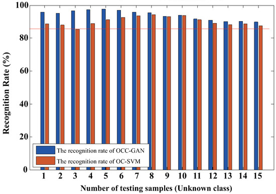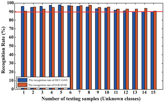In order to compare the OvR-SVM with the OCC-GAN model, we set the threshold of this experiment as 0.600049 and train the models with the same 15 unknown test classes. The experimental results are shown in Figure 15. When the number of the test class is small, the unknown class recognition effect of the OCC-GAN model is slightly better. On the contrary, while the number of the test samples is increasing, the unknown class recognition effect of the OvR-SVM model is better. However, the recall rate of OvR-SVM is only 73%, which is far lower than the recall rate of 97% of the OCC-GAN model.
