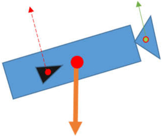 See Figure 2 for an illustration of the case where we apply while the pitch is not zero. In Figure 2, the lifting force (the normal component of such that the component is normal to the body axis) generated by the fins is depicted as a red dotted arrow. Also, the lifting force (the normal component of such that the component is normal to the body axis) generated by the cavitator is depicted as a green arrow. These two lifting forces do not generate a moment, since is nullified by . which is applied to the CG is depicted as a bold arrow in Figure 2.