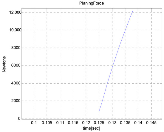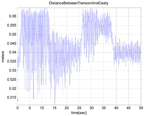 Figure 10 shows the distance between the transom of the vehicle and the cavity wall. In the case where this distance is less than zero, planing occurs. The planing force does not appear in the simulation, since the distance does not decrease below zero.