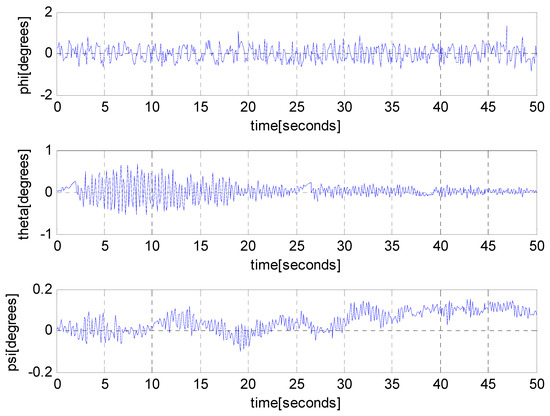 Figure 9 shows the change of deflection angles with respect to time. Since changes as time goes on, we can see that the deflection angles gradually change as time goes on. This change can be seen clearly in the last subplot of Figure 9. Also, Figure 9 shows that deflection angles are disturbed considerably.