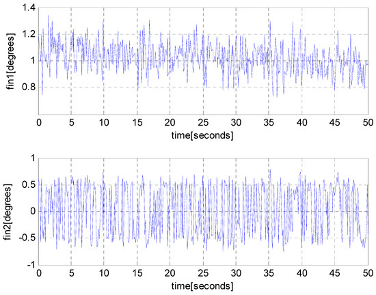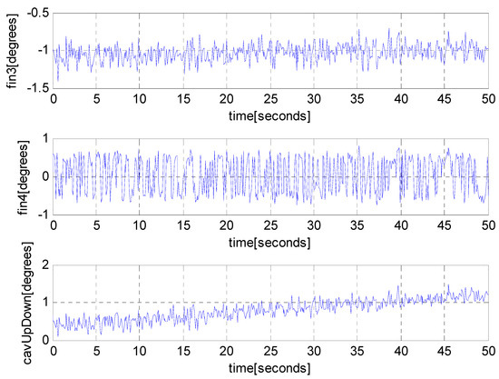 Fins 2 and 4 are called rudders that stabilize the vehicle in roll. In ideal environments without disturbances, the roll of the vehicle does not change as time goes on. Thus, we do not have to control the rudders (fins 2 and 4). However, due to disturbances in real environments, the roll of the vehicle changes as time goes on. This situation occurred as we add zero-mean Gaussian noise to control inputs of the vehicle to simulate disturbance in inputs. To stabilize the roll to zero in noisy environments, we control rudders, as presented in Section 3.6.