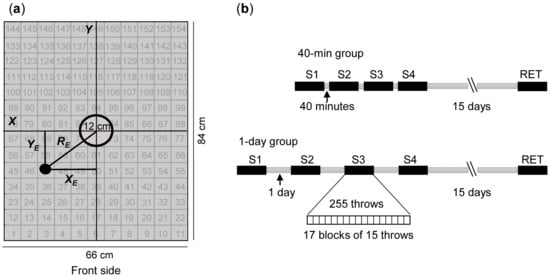 Each participant performed 1020 throws equally divided over four sessions of training (S1, S2, S3, S4; Figure 1b). Each session consisted of 255 throws divided into 17 blocks of 15 throws, with inter-block pauses of about 2 min. Four men and four women were randomly assigned to one of two groups: One group performed the training sessions with breaks of 40 min between the sessions (40-min group), whereas the other group spaced the practice sessions with intervals of 1 day (1-day group). After 15 days from the S4, both groups executed one additional session of 255 throws to test long-term memory retention (RET).