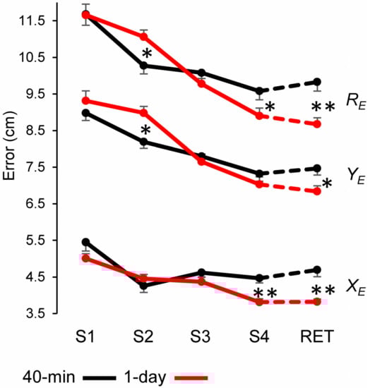 Learning time course over training and retention sessions. Changes in performance are represented as radial error (RE), medial-lateral error (XE) and anterior-posterior error (YE, throwing axis). Each point represents the grand average ± standard error over the subjects calculated for session 1–4 (S1, S2, S3, S4) and retention session (RET) and for each group (40-min group, black lines; 1-day group, red lines). * p < 0.05; ** p < 0.01.