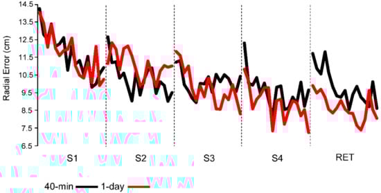 When the directional components of throwing were included in the three-way ANOVA with session and group, a main effect of direction was observed (F1,14 = 180,373; p < 0.001; η2p = 0.93), with the error along the axis of throwing greater than along the medial-lateral axis (YE and XE in the Figure 2).There was a significant interaction between session and direction (F4,56 = 11,884; p < 0.001; η2p = 0.46), indicating a different rate of improvement between the directions, over the sessions. As reported for the RE, a main effect of session was observed also for YE (F4,56 = 31.070; p < 0.001; η2p = 0.69) and XE (F4,56 = 8.652; p < 0.001; η2p = 0.38). However, the interaction between group and session was significant for YE (F4,56 = 3.073; p = 0.023; η2p = 0.18), but not for XE (F4,56 = 1.964; p = 0.113). Although there was no significant interaction between group and session for XE, the comparison between the groups at each session shows that the differences at the S4 and RET were larger for XE (S4: t32 = 4.147; p < 0.001; d = 1.422; RET: t32 = 4.388; p < 0.001; d = 1.505) than YE (S4: t32 = 1.024; p = 0.314; RET: t32 = 2.630; p = 0.013; d = 0.902). Moreover, the contribution of the YE and XE to the RE changes, assessed by computing the partial coefficient of determination as Equation (3), were similar for the 40-min group (R2 = 0.99; r2 = 0.94 for XE; r2 = 0.98 for YE) and the 1-day group (R2 = 0.99; r2 = 0.84 for XE; r2 = 0.99 for YE).