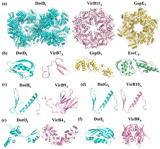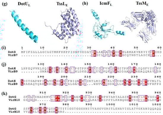 Figure 3. Crystal structure and amino acid sequences alignment of T4BSS proteins and their structural homologs. (a) ATPases of Legionella pneumophila DotBL (PDB id: 6GEB), Agrobacterium tumefaciens VirB11A, Vibrio fluvialis GspEV; (b) Outer membrane proteins of L. pneumophila DotDL (PDB id: 3ADY), A. tumefaciens VirB7A, Vibrio fluvialis GspDV, and Escherichia coli EscC (PDB id: 3GR5); (c) Periplasmic proteins of L. pneumophila DotHL, A. tumefaciens VirB9A; (d) Membrane-spanning proteins of L. pneumophila DotGL and A. tumefaciens VirB10A; (e) Inner membrane (IM)-associated proteins of L. pneumophila DotOL and A. tumefaciens VirB4A; (f) IM proteins of L. pneumophila DotIL and A. tumefaciens VirB8A; (g) Inner membrane proteins of L. pneumophila DotUL, and E. coli TssLE (PDB id: 3U66); (h) IM proteins of L. pneumophila IcmFL and E. coli TssME (PDB id: 4Y7M); (i) N-terminal domain of L. pneumophila DotDL and A. tumefaciens VirB7A; (j) Residues 168–227 of L. pneumophila DotHL and N-terminal domain of A. tumefaciens VirB9A; (k) C-terminal domain of L. pneumophila DotGL and A. tumefaciens VirB10A.