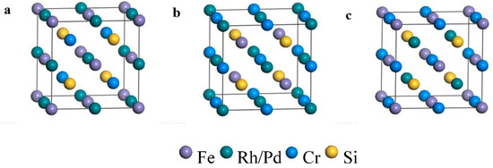 Here, , , and refer to the energies of each isolated atom [37]. It can be found that formation energies for these alloys are both negative values, which are −3.12 eV for FeRhCrSi and −1.97 eV for FePdCrSi, indicating that these two alloys are stable and cannot be decomposed easily. Furthermore, these alloys have great negative cohesive energies, which are −20.41 eV for FeRhCrSi and −18.66 eV for FePdCrSi, implying that they have good chemical stability in practice and are likely to be synthesized in the experiment.