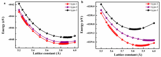 Energy optimization with different crystal structures of (a) FeRhCrSi and (b) FePdCrSi.