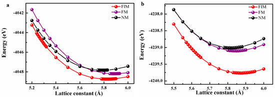 Energy optimization with different magnetic states of (a) FeRhCrSi and (b) FePdCrSi.