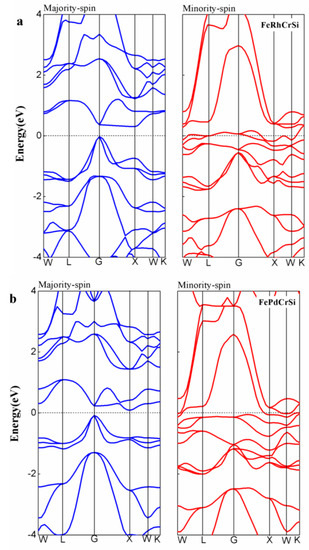 In this part, the electronic and magnetic structure of FeRhCrSi and FePdCrSi at their equilibrium lattice constants have been discussed in detail. The calculated band structures of FeRhCrSi and FePdCrSi compounds have been displayed in Figure 4. From Figure 4a,b, it can be found that both FeRhCrSi and FePdCrSi compounds show quite similar band structure characters. In the majority-spin channel, the Fermi level is located in an indirect band gap. The conduction band minimum (CBM) appears at the X point and the valence band maximum (VBM) occurs at the G point of the Brillouin zone. The values of the indirect band gaps in the majority-spin channel are 0.336 eV and 0.177 eV for EQH compounds FeRhCrSi and FePdCrSi, respectively. However, their bands show a metallic cross over at the Fermi level in the minority-spin channel. This results in their 100% spin polarization. Thus, the EQH compounds FeRhCrSi and FePdCrSi are HMs.