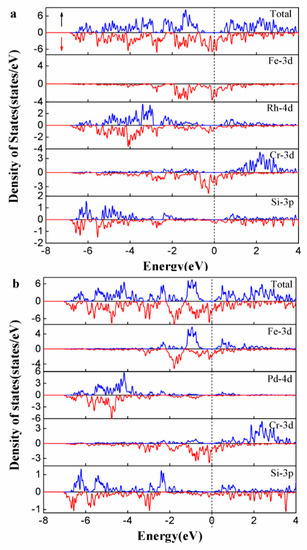Figure 5a,b show the calculated total and partial density of states (DOS) of FeRhCrSi and FePdCrSi at their equilibrium lattice constants. From Figure 5, one can further understand their electronic structures. It can be seen that there is a metallic overlapping with the Fermi level in the minority-spin channel for both the EQH compounds FeRhCrSi and FePdCrSi. By contrast, in the majority-spin direction, the Fermi level locates in a relative wide energy gap (the half-metallic gap). Therefore, the EQH compounds FeRhCrSi and FePdCrSi are HMs that are consistent with the above discussion of their band structures. For FeRhCrSi and FePdCrSi compounds, because of the similar atomic configuration, they present two quite similar total and partial DOS. Here, we take the FeRhCrSi compound as an example and give a detailed discussion on the DOS. From Figure 5a, it can be found that the DOS is mainly dominanted by the Si atom in the lower energy region (−7 eV–5 eV) for the two spin directions. In the energy region −5 eV to −3 eV, the DOS are mainly occupied by Rh-4d states. In the range of −3 eV to −1 eV, except a small contribution of Rh-4d and Cr-3d states, both spin channels are dominated by Fe-3d states. In the energy region around the Fermi level (−1 eV to 1 eV), the energy peak is the result of the common contribution of Fe, Rh, and Cr atoms with d orbitals. It can be observed that, in the minority spin, the main contribution to the DOS is the strong hybridization among the Fe-3d state, Rh-4d state, and Cr-3d state around the Fermi level. In the majority spin, the energy gap mainly comes from the covalent hybridization between the nearest neighbor atoms: Fe and Cr. Galanakis et al. [34] have reported that the formation of the bonding and antibonding states can arise from the strong covalent hybridization between the lower-energy d states (higher-valent) transition metal atom (such as Fe) and the higher-energy d states (lower-valent) transition metal (such as Cr). And then, the half-metallic band gap generates between the bonding and antibonding bands. It has also been reported that, due to the strong intra-atomic exchange interaction, the low valence transition metal atom usually has a large spin splitting [35]. From Figure 5a, it can be found that, compared with Fe and Rh atoms, the Cr atom with a lower valent has a larger spin splitting. Thus, the Cr atom is the main contributor to the total magnetic moment of the FeRhCrSi compound.