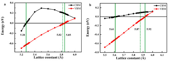 Figure 6 shows the CBM and VBM values under different hydrostatic strain for FeRhCrSi and FePdCrSi. From Figure 6, it can be obviously found that the half-metallicity of FeRhCrSi and FePdCrSi compounds can be kept in wide lattice constants that range from 5.28 Å–5.85 Å for FeRhCrSi and 5.61 Å–5.92 Å for FePdCrSi, respectively. This indicates that these two EQHs can keep their half-metallic properties in the lattice distortion range of −9.3% to 0.5% and −4.4% to 1% (relative to their equilibrium lattice constants). For FeRhCrSi and FePdCrSi compounds, it can be clearly seen that its half-metallic property is very robust to the lattice constant compression. Their half-metallicity cannot be destroyed until the lattice constant is compressed to 5.28 Å (by −9.3%) for FeRhCrSi and 5.61 Å (by −4.4%) for FePdCrSi, their conduction bands have an overlapping with the Fermi level at 5.28 Å and 5.61 Å. However, the half-metallicity of FeRhCrSi is relatively sensitive to the lattice constant expansion and their half-metallic properties will be destroyed when their lattice constants are expanded by about 0.5% and 1% for FeRhCrSi and FePdCrSi compounds, respectively.