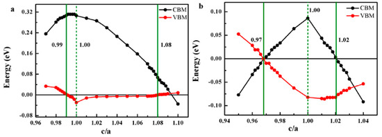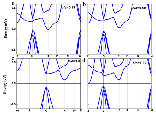 Figure 7a,b show the VBM and CBM values under different c/a ratios in the range of 0.96–1.10 and 0.95–1.04 for FeRhCrSi and FePdCrSi, respectively. In this case, the cubic unit cells are compressed or stretched into a tetragonal one and the volumes of them are kept unchanged. As seen in Figure 7, it seems that their half-metallic properties are also robust to the tetrogonal deformation of lattice constants for FeRhCrSi and FePdCrSi compounds. In detail, FeRhCrSi and FePdCrSi compounds can keep their half-metallic properties when the c/a ratios change from 0.99 to 1.08 and 0.97 to 1.02, respectively. As the c/a ratios of FeRhCrSi and FePdCrSi decreases or increases from 1.0, their CBM value decrease and the value of VBM increases. Finally, this leads to the reduction or disappearance of their half-metallic band gaps. In order to further observe the change of the half-metallic bang gap with the tetragonal distortion, several majority-spin band structures around Fermi level at different c/a ratios for FeRhCrSi compound have been shown in Figure 8. From Figure 8, it can be clearly seen that the half-metallic band gap of FeRhCrSi decreases with tetragonal distortion and disappears at c/a = 0.97 and c/a = 1.02.