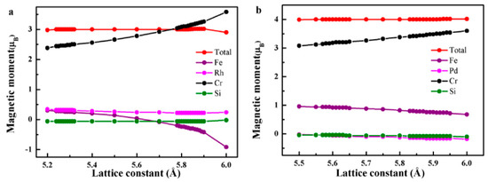 The total and partial magnetic moments as functions of lattice constants for (a) FeRhCrSi and (b) FePdCrSi.