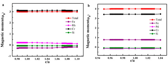 The total and partial magnetic moments as functions of c/a ratios for (a) FeRhCrSi and (b) FePdCrSi.