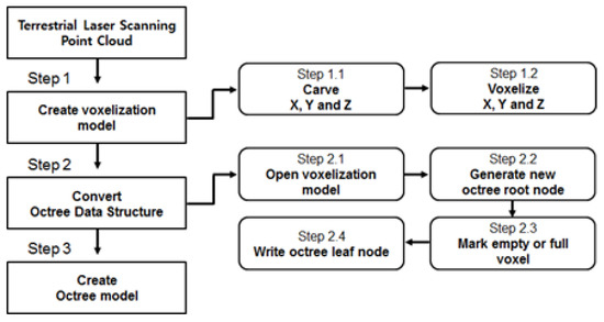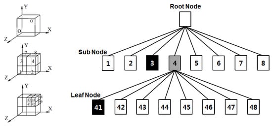Octree is a data representation method that creates a bounding box for a given shape, and stores it as a visualization object if the shape is contained in the hexahedron equally divided in the x, y, and z coordinates [46]. The octree divides the bisected space in each direction of the x, y, and z axes into eight subspaces and expresses them in a finer area. The eight sub-spaces can be stored in a tree structure as an element called a node, and the depth level of the octree is determined by the number of divided bounding boxes [47]. In this study, the 3D object model (Voxel model) is first generated to easily remove empty nodes by checking empty cells in the sub and left nodes. Thus, it is efficient to implement segmentation and octree in the spatial properties of 3D objects rather than in irregularly distributed point clouds.