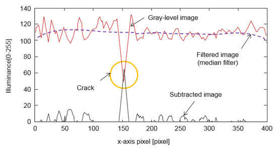 The obtained gray-level image is processed with improved subtraction processing. Subtraction processing typically eliminates the slight variation such as shadings or irregularly noticeable components. Thus, it is for elimination of the noise as well as the illuminated components from cracks. Figure 4 illustrates how the subtraction finds cracks against the other objects including shading. Illuminance of the original gray-level visualizes objects in the image, and the median filtering removes out sharp illuminance changes that represent small noises or cracks and remains smoothed background image representing concrete surface, large objects, and shading. Then, the subtraction of the original image from the filtered image removes out the background image while remaining objects with sharp illuminance. Since the crack is visualized by very low illuminance profile with shape change, the crack object can be highlighted from the subtracted image, if combined with subsequent image processing to remove out small noises.