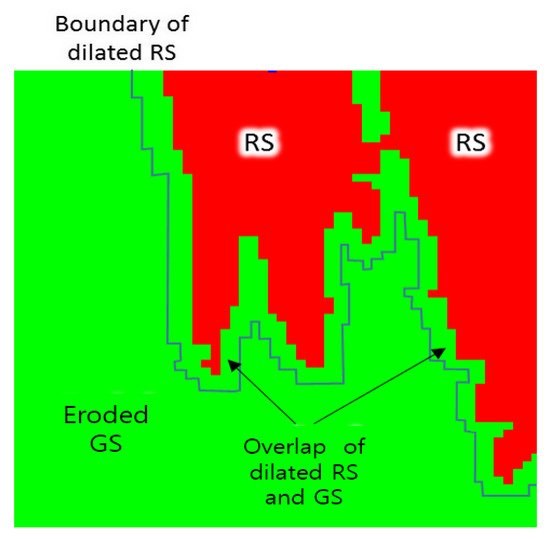 In Section 3.1, RS data have been separated using the K-means clustering to remove out the parts corresponding to the structural joints and sediments. However, the gradient at the boundary of RS data may still be included at the boundary of the adjacent GS data. Since objects with a linear and thin shape are to be identified during the image processing, the gradient remaining at the boundary of the GS data can be misrecognized as cracks. In this study, the GS data is dilated by 5 pixels and the overlap of the dilated RS data and the GS data is removed from the GS data, resulting in erosion of the GS data at the interface with RS data as shown in Figure 5. This process can significantly minimize the false recognition of cracks.