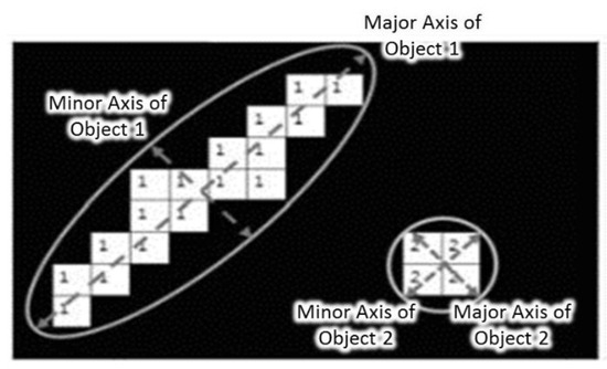 After the morphological closing, blobs that had small areas and small eccentricity (ratio between the major and minor axes of an object) as shown in Figure 6 were finally removed out. In this study, the objects with areas smaller than 100 pixels or eccentricity smaller than 0.3 in the original image were removed out.