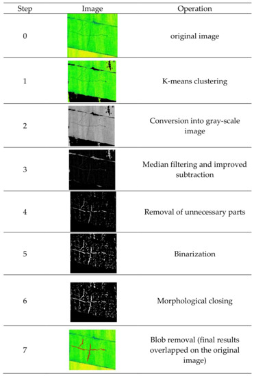 Figure 7 shows an example showing how the seven image processing steps in Table 1 affected the original image to the end of crack identification. The figure shows that the cross-shape cracks on the original image are highlighted against the structural joints, sediments, and noises by proceeding the steps.