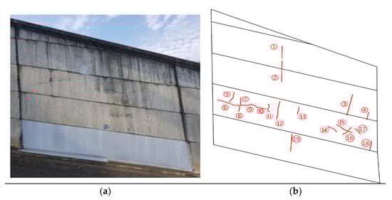 The enlargement of the target structure and crack pattern map by visual inspection. (a) Target structure; (b) Crack pattern map.